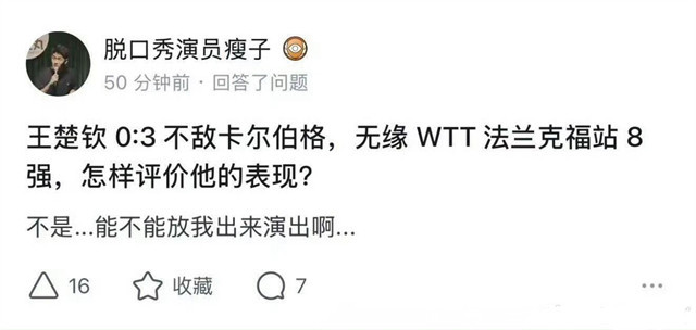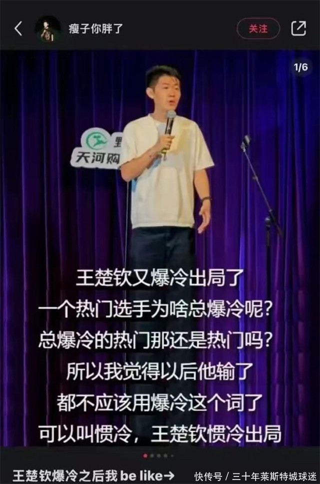 狼狈的是,王楚钦输球后,最欢笑的反而是因为吐槽王楚钦频频输球的脱口秀演员瘦子,他在某平台上回答了如何看待王楚钦0-3不敌卡尔伯格的问题时,写了“不是,能不行放我出去献艺?”可见,他关于我方此前的言论并莫得以为何处辨别,此前他称王楚钦输球出局不叫“爆冷”叫“惯冷”、32是王楚钦的“运道数字”,被球迷讨要说法从而被解约丢了使命,当今他的晨曦到了吗?