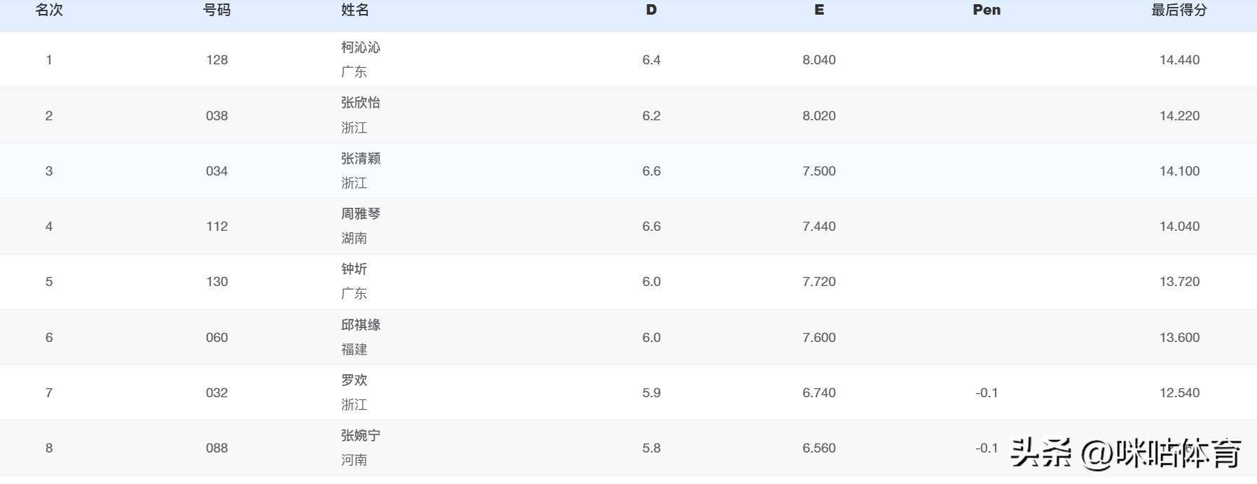 女子均衡木决赛,广东队柯沁沁以14.440拿下金牌,这亦然她个东谈主在本届全运会拿到的第五金!浙江队张欣怡、张清颖划分摘得银、铜牌。