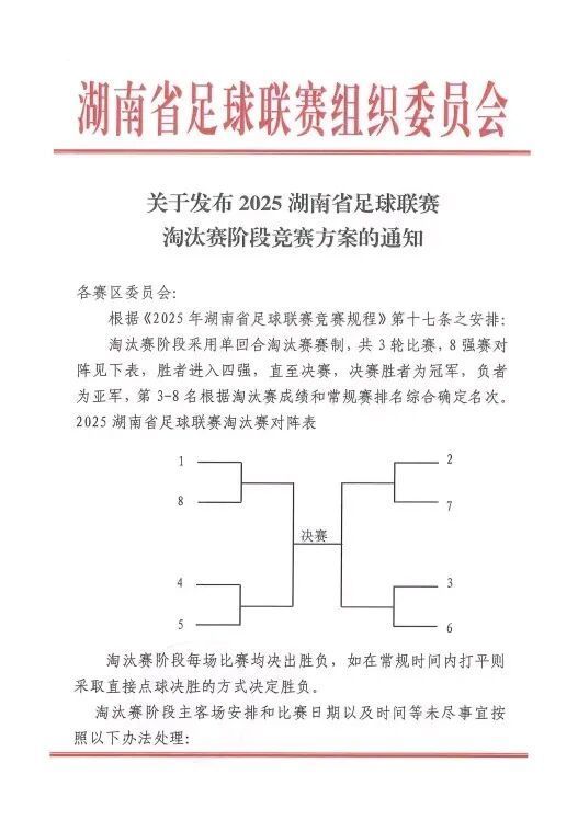 12月4日,记者从湖南省足球联赛组委会获悉:湘超淘汰赛阶段,将接受单回合淘汰赛赛制,共3轮比赛,8强赛胜者插足四强,直至决赛。决赛胜者为冠军,负者为亚军。第3-8名把柄淘汰赛收货和老例赛排名抽象笃定排行。淘汰赛阶段,要是在老例技能内打平,则选择平直点球决胜的形式决定输赢。